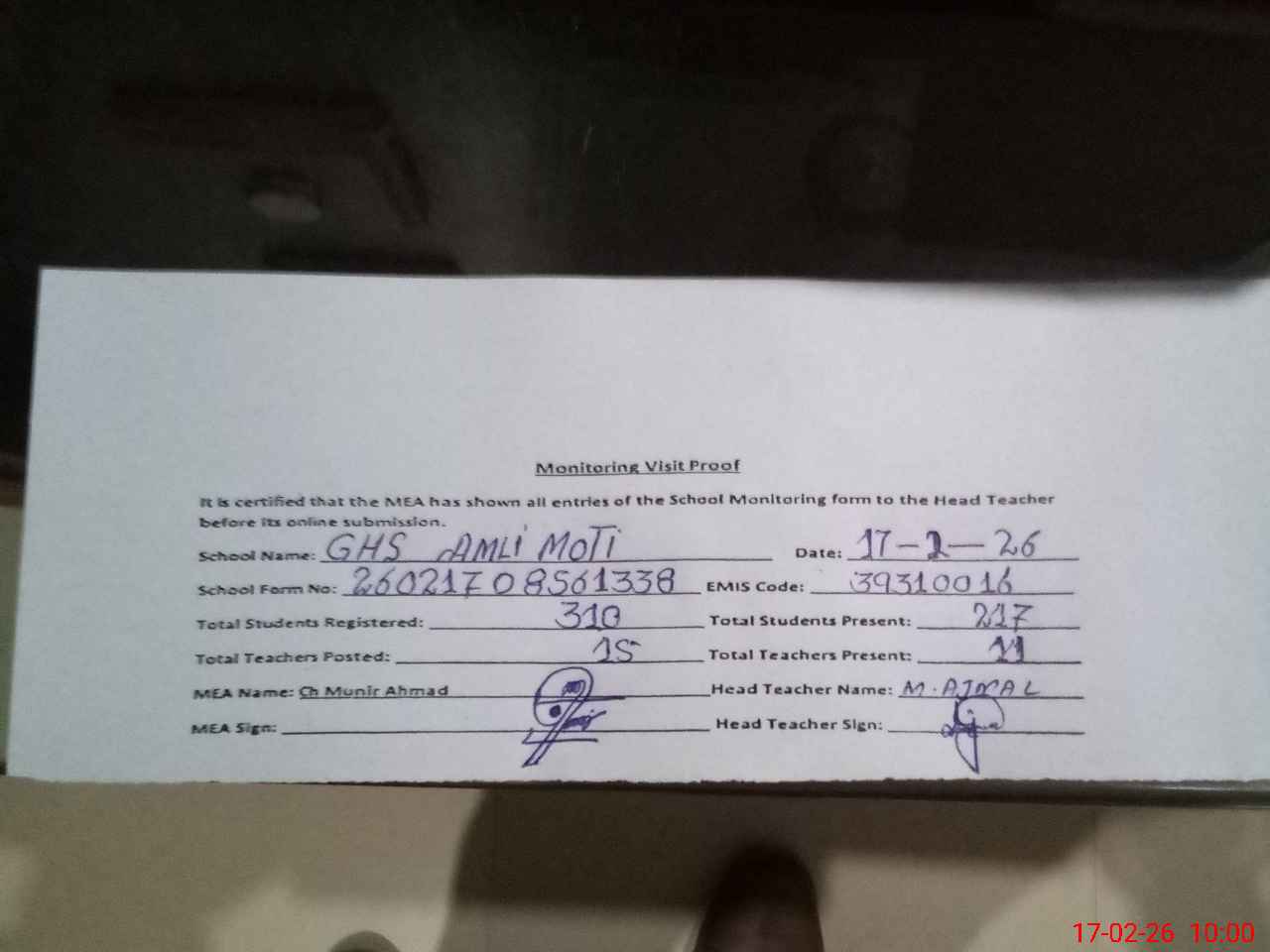 | Attendance Register | Head Teacher | MEA with School | Visit Proof |