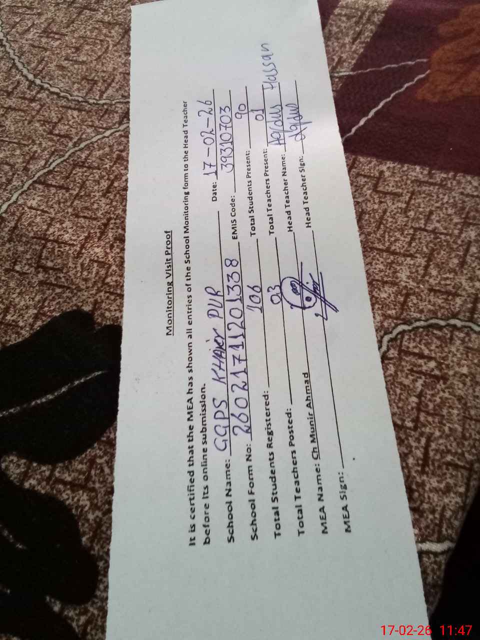 | Attendance Register | Head Teacher | MEA with School | Visit Proof |
