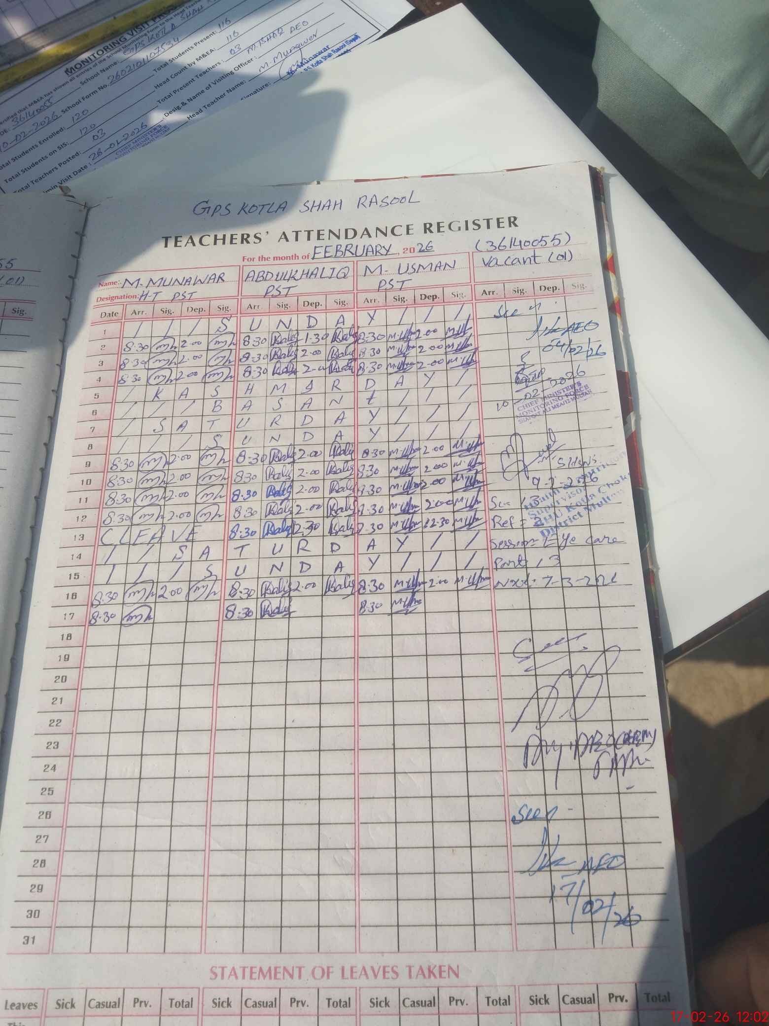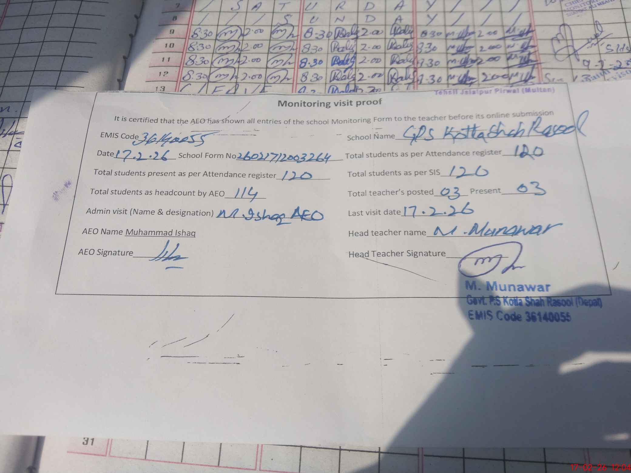 | Attendance Register | Head Teacher | MEA with School | Visit Proof |