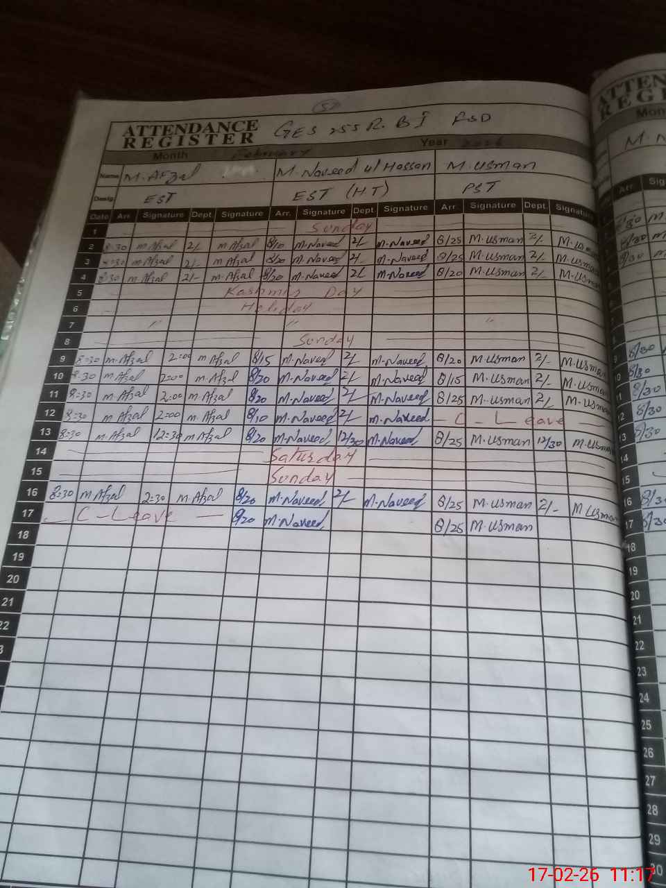 | CNIC | Full Name | Designation | R/C | Absence during last cal. month |