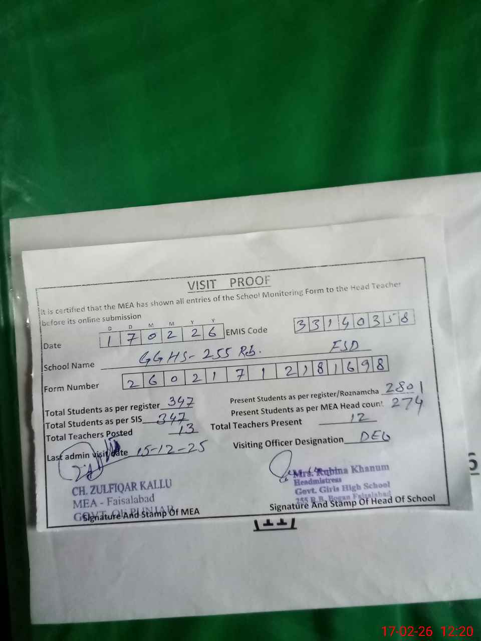 | EMIS Code: 33140358 | Name of School: GGHS CHAK 255 RB BOGAN | |||
