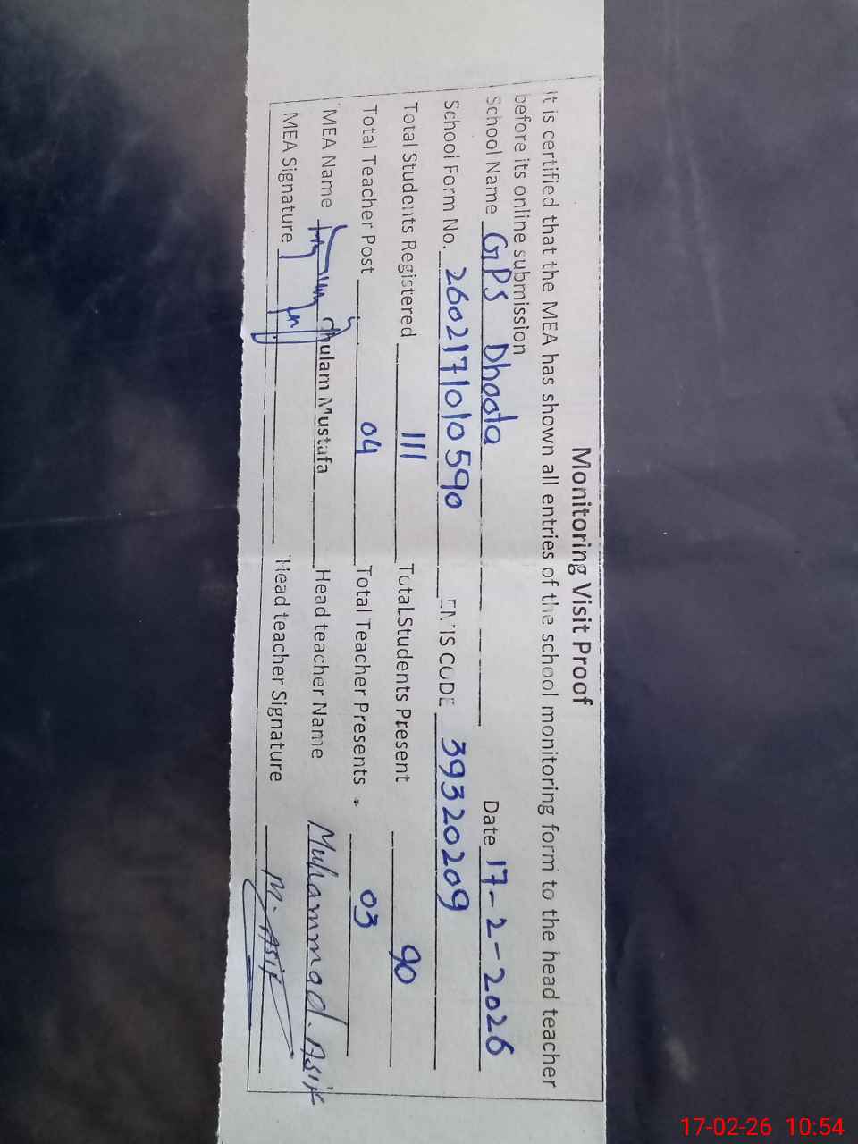 | EMIS Code: 39320209 | Name of School: GPS DHOOTA | |||