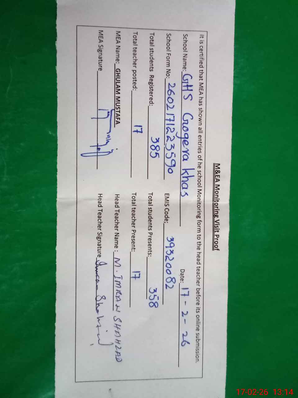 | Attendance Register | Head Teacher | MEA with School | Visit Proof |