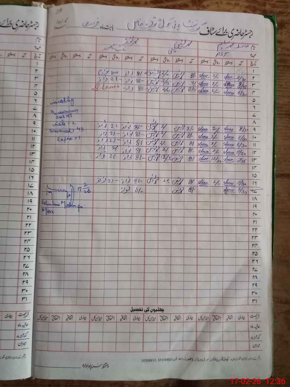 | CNIC | Full Name | Designation | R/C | Absence During Last Calender Month |