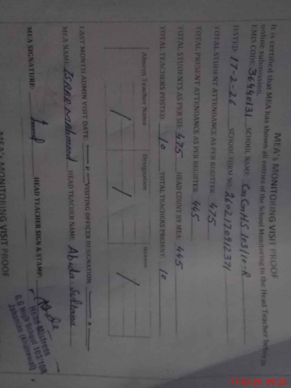 | Certified that this School was Inspected by the Undersigned MEA/DMO Today and the Information Stated Above is as Per Record. | |||||