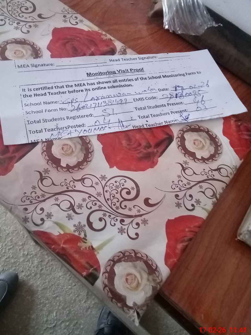 | Attendance Register | Head Teacher | MEA with School | Visit Proof |