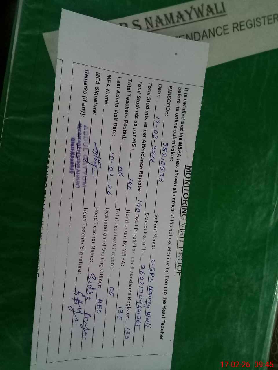 | Attendance Register | Head Teacher | MEA with School | Visit Proof |