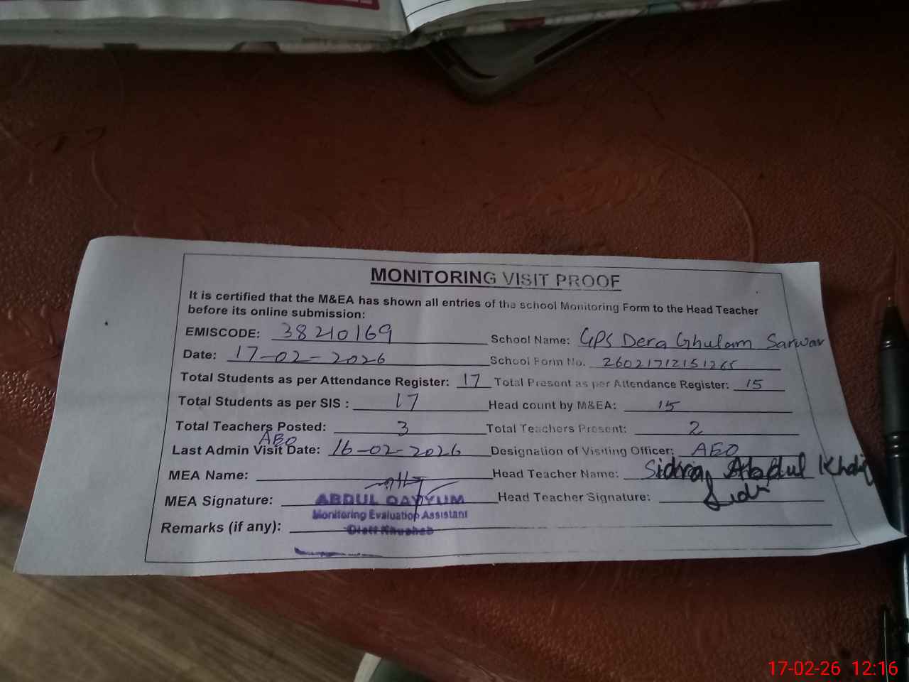 | Attendance Register | Head Teacher | MEA with School | Visit Proof |