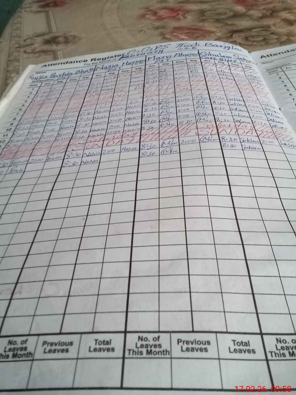 | CNIC | Full Name | Designation | R/C | Absence During Last Calender Month |