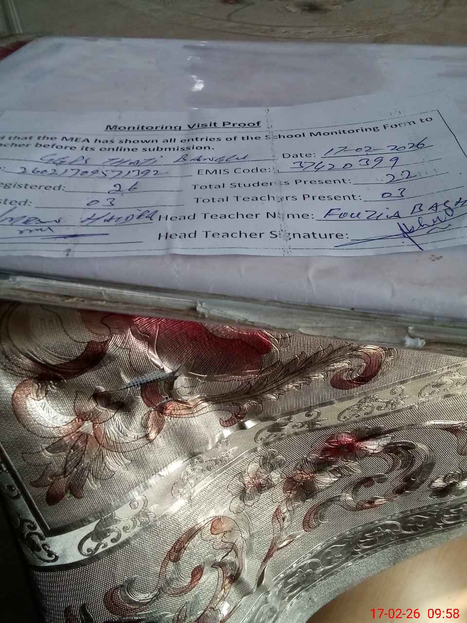 | Attendance Register | Head Teacher | MEA with School | Visit Proof |