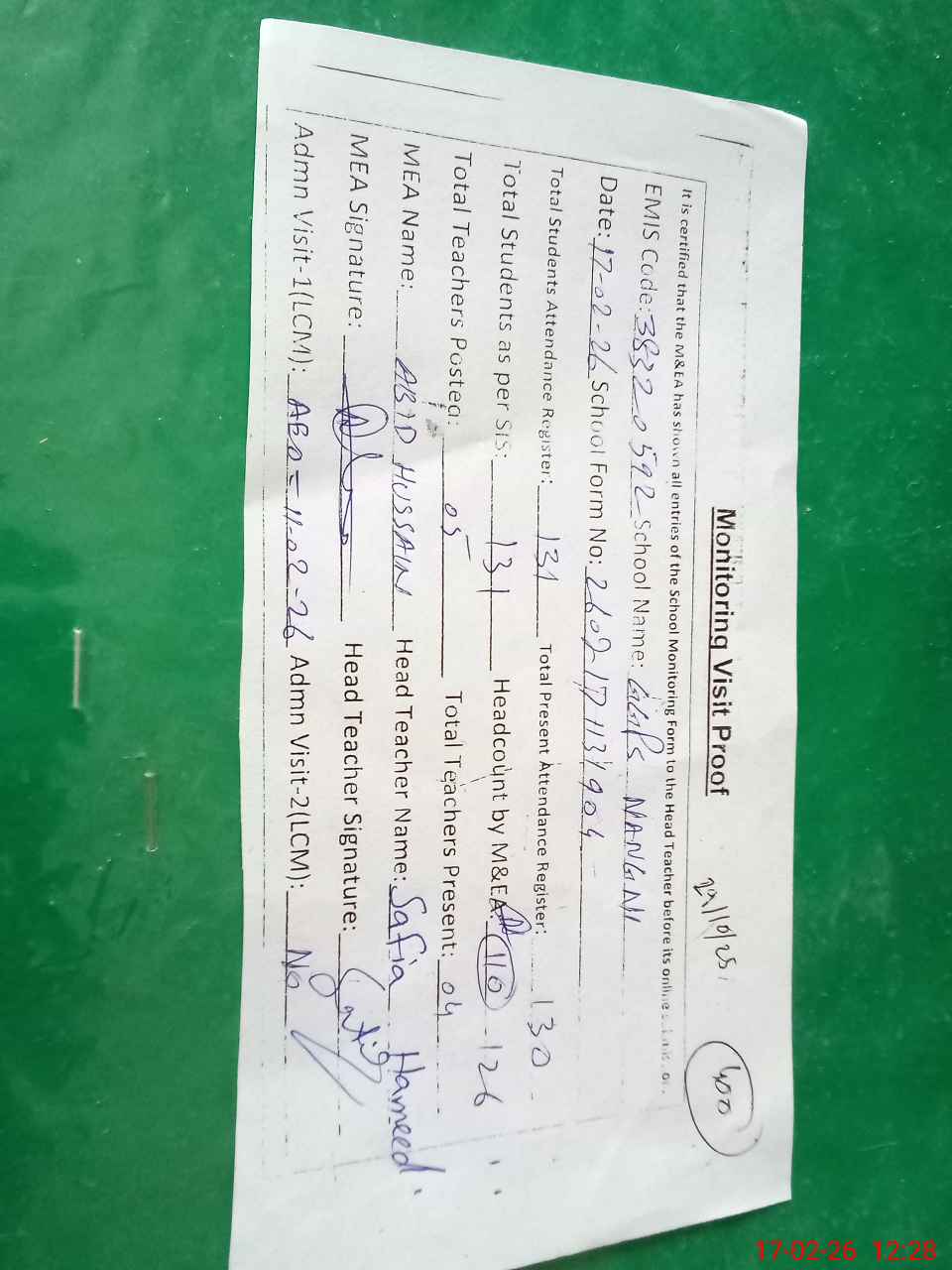 | Attendance Register | Head Teacher | MEA with School | Visit Proof |