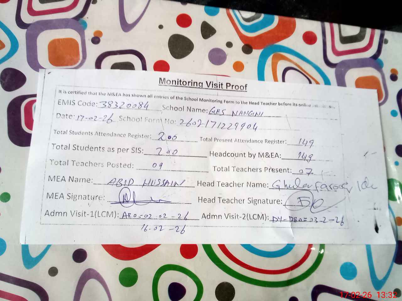 | Attendance Register | Head Teacher | MEA with School | Visit Proof |