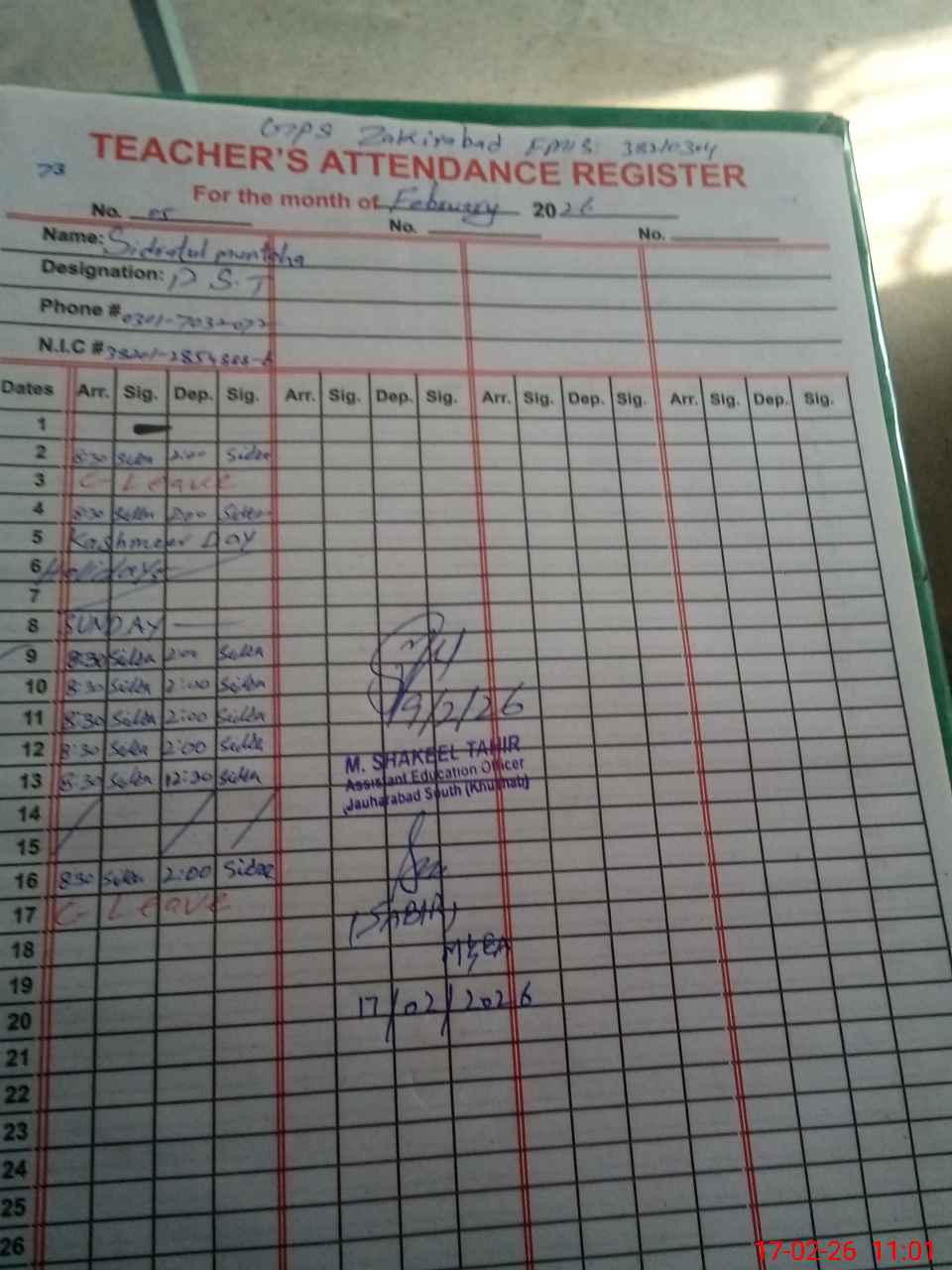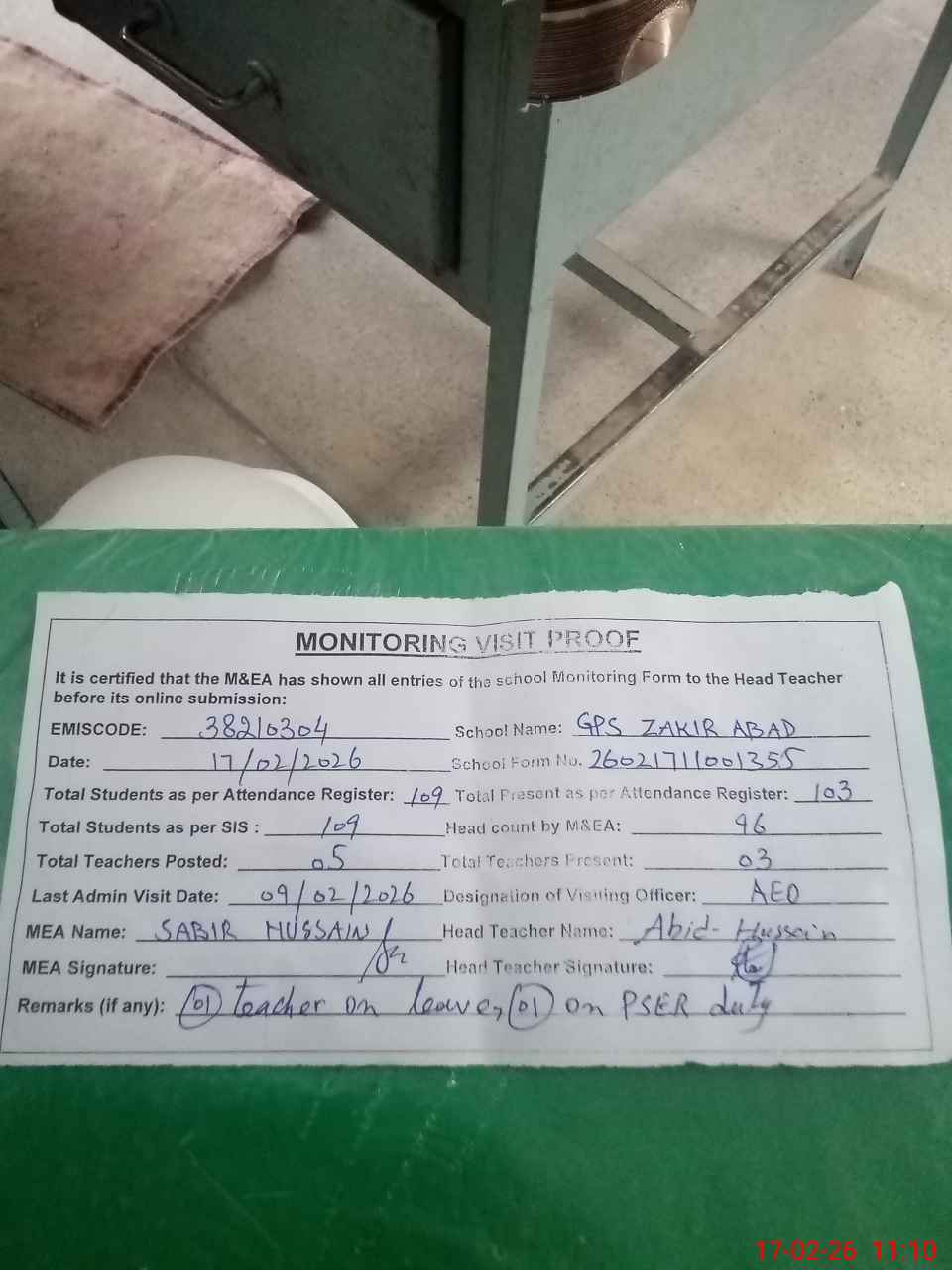 | Remarks (Use Separate Page if Required): no teacher absent total students on register 109 total students on SiS 109 Last admin visit by AEO on 09 Feb 2026 | |||||