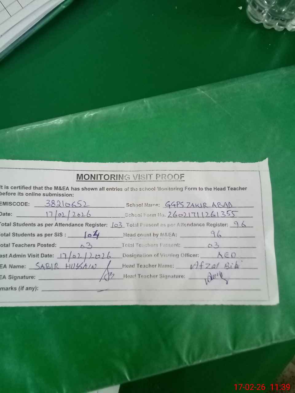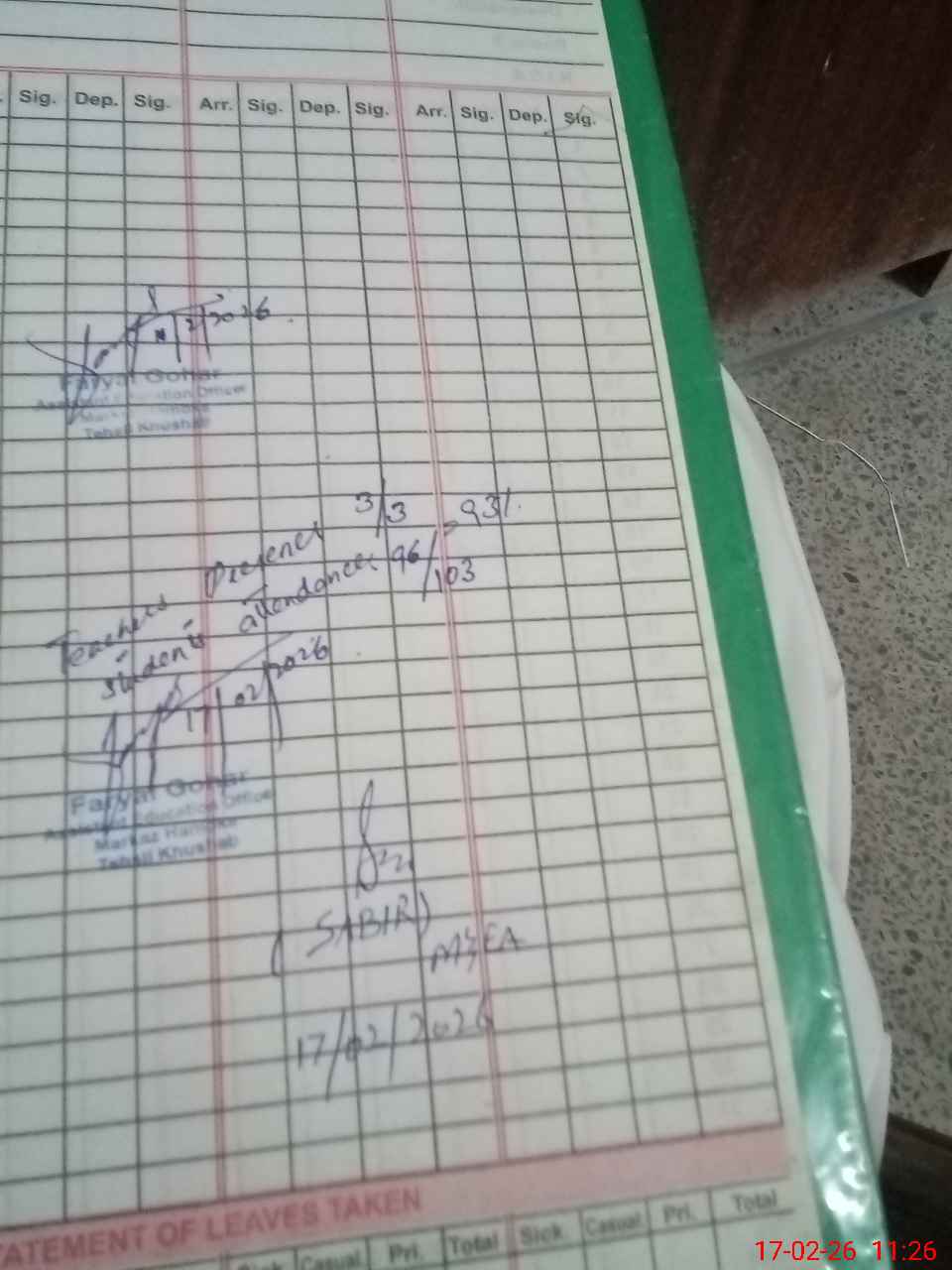 | Remarks (Use Separate Page if Required): no teacher absent total students on register 103 total students on SiS 104 last admin visit by AEO on 17 Feb 2026 | |||||