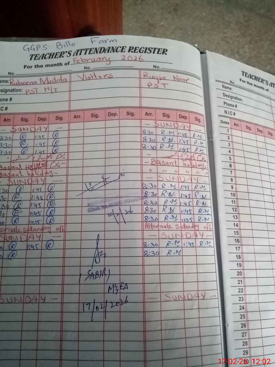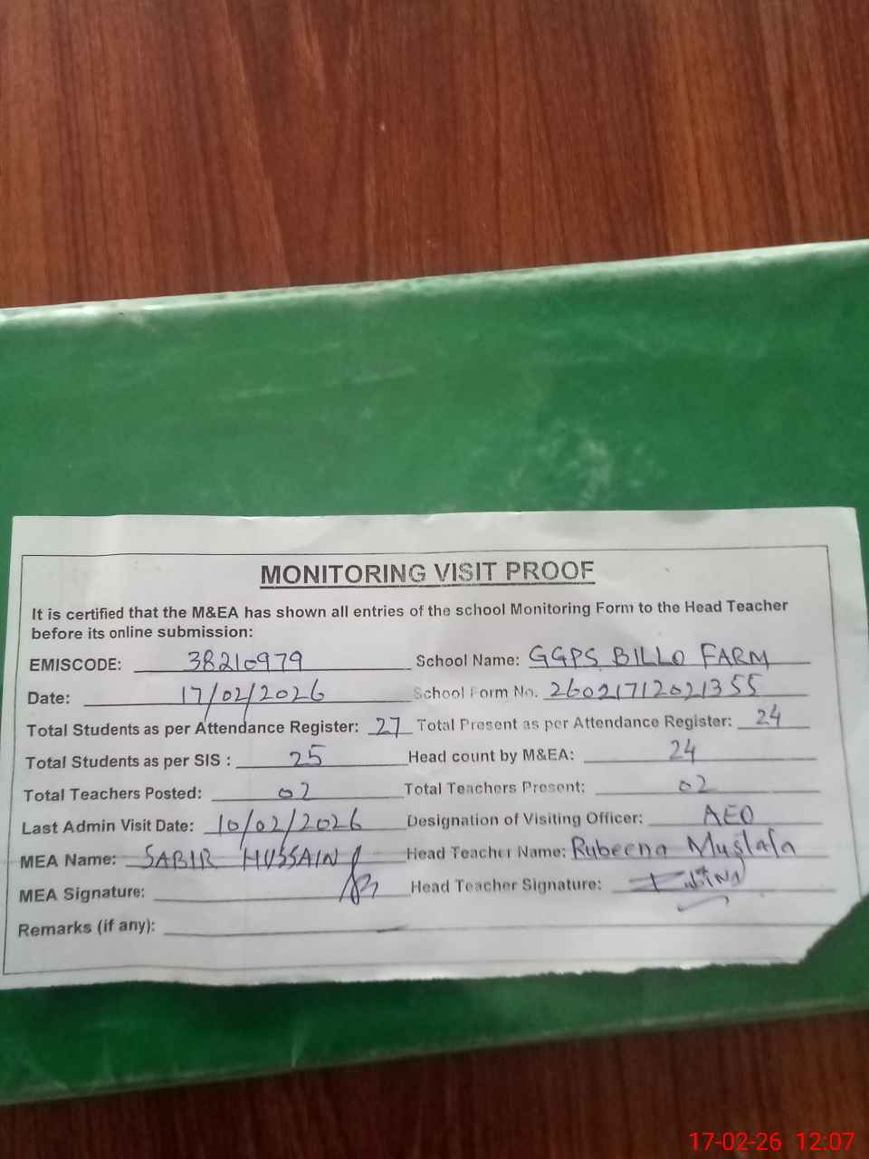 | Remarks (Use Separate Page if Required): no teacher absent total students on register 27 total students on SiS 25 last admin visit by AEO on 10 Feb 2026 | |||||