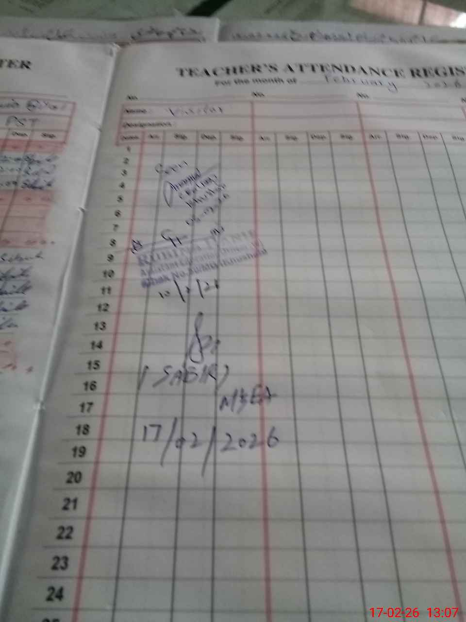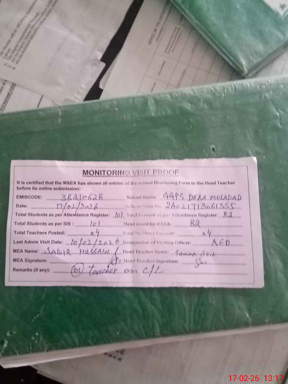 | Remarks (Use Separate Page if Required): no teacher absent total students on register 101 total students on SiS 101 Last admin visit by AEO on 10 Feb 2026 | |||||