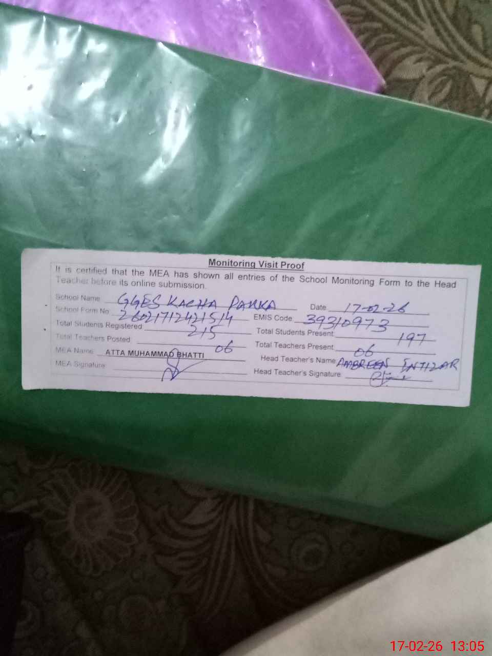 | Attendance Register | Head Teacher | MEA with School | Visit Proof |