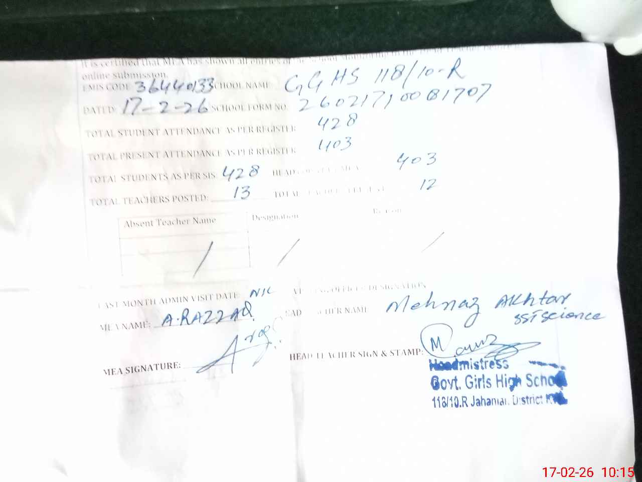 | EMIS Code: 36440133 | Name of School: GGHS 118/10-R, JAHANIAN | |||