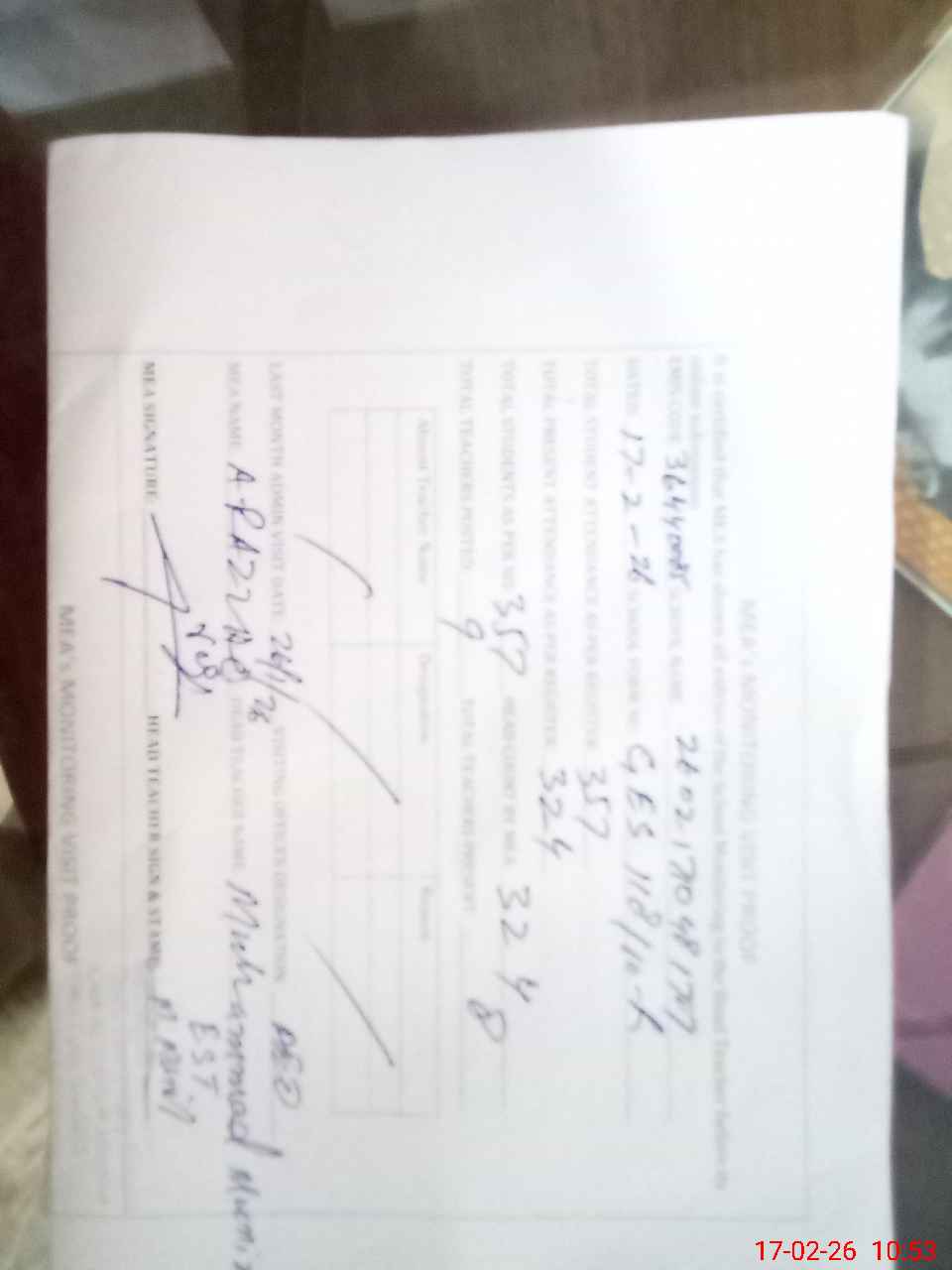 | Attendance Register | Head Teacher | MEA with School | Visit Proof |