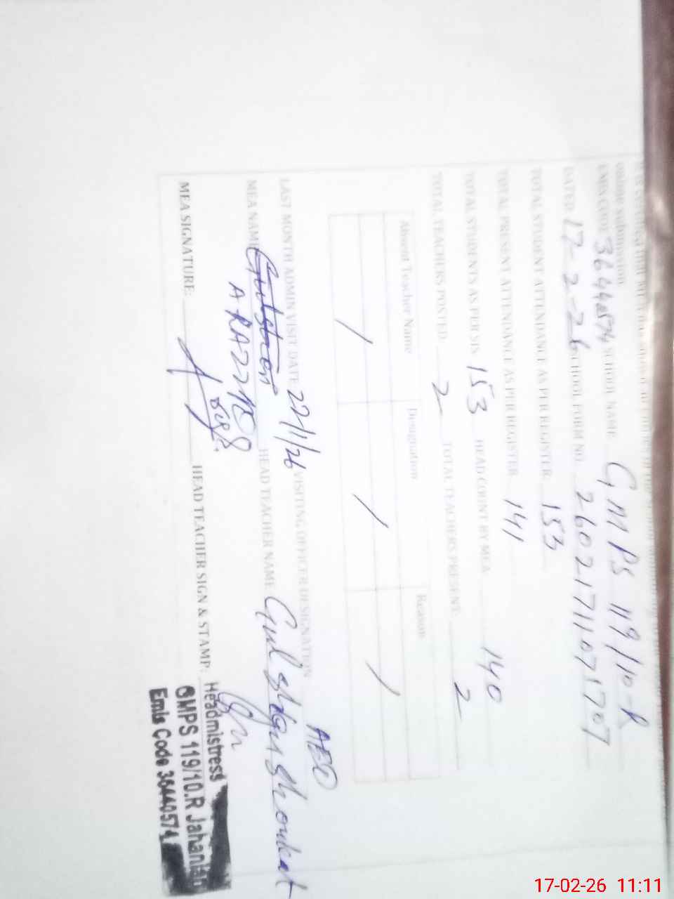 | Attendance Register | Head Teacher | MEA with School | Visit Proof |