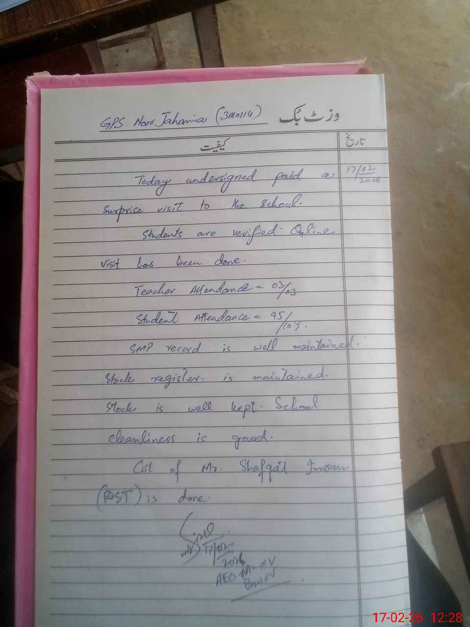 | Certified that this School was Inspected by the Undersigned MEA/DMO Today and the Information Stated Above is as Per Record. | |||||