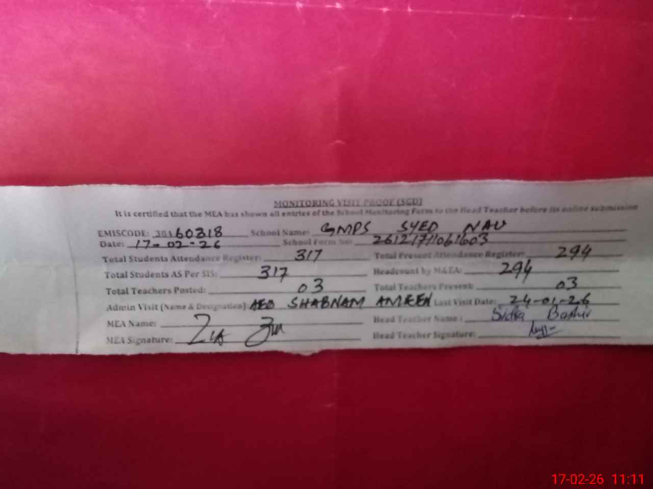 | EMIS Code: 38460318 | Name of School: GMPS SYED NAU | |||