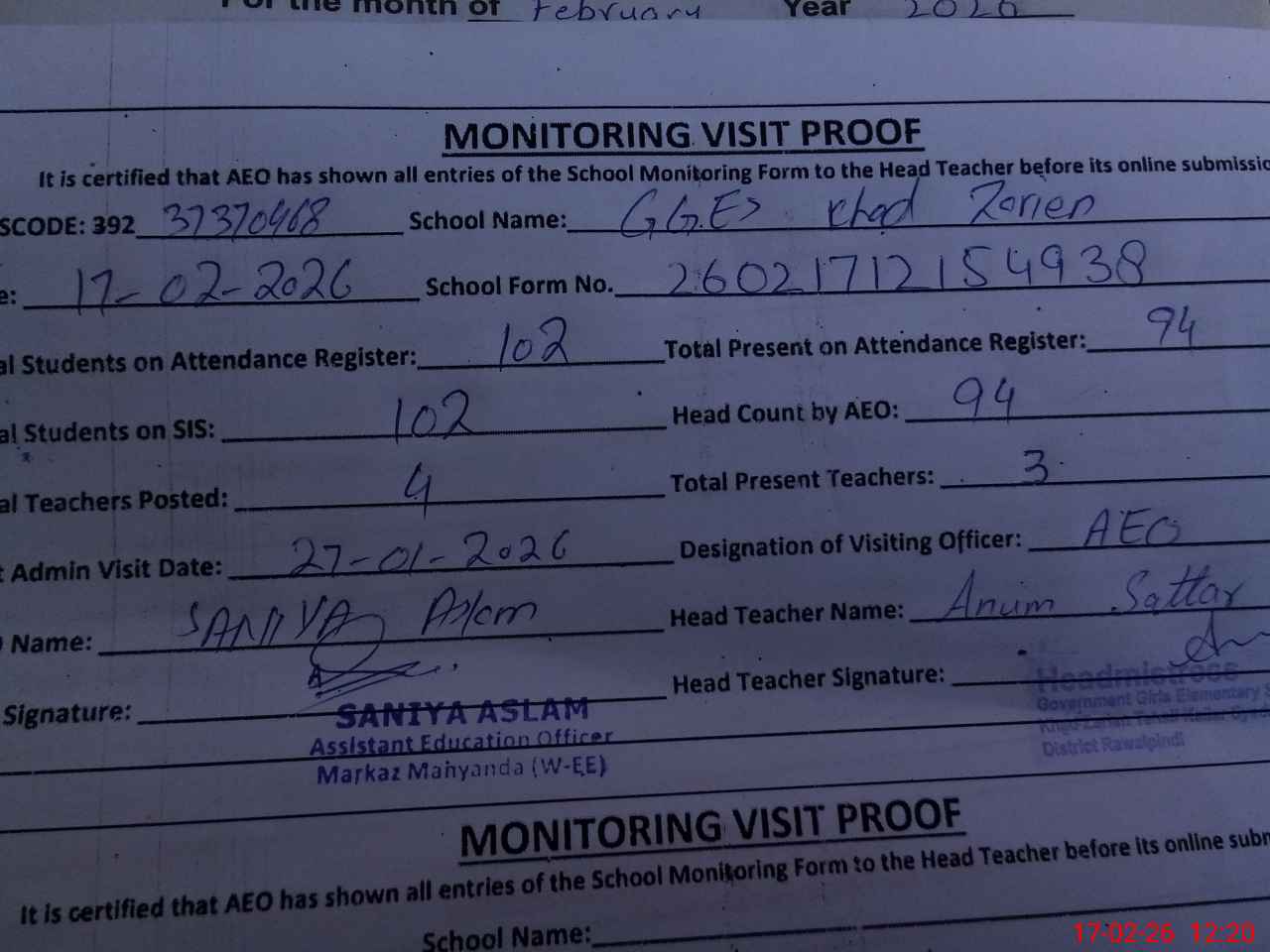 | Attendance Register | Head Teacher | MEA with School | Visit Proof |
