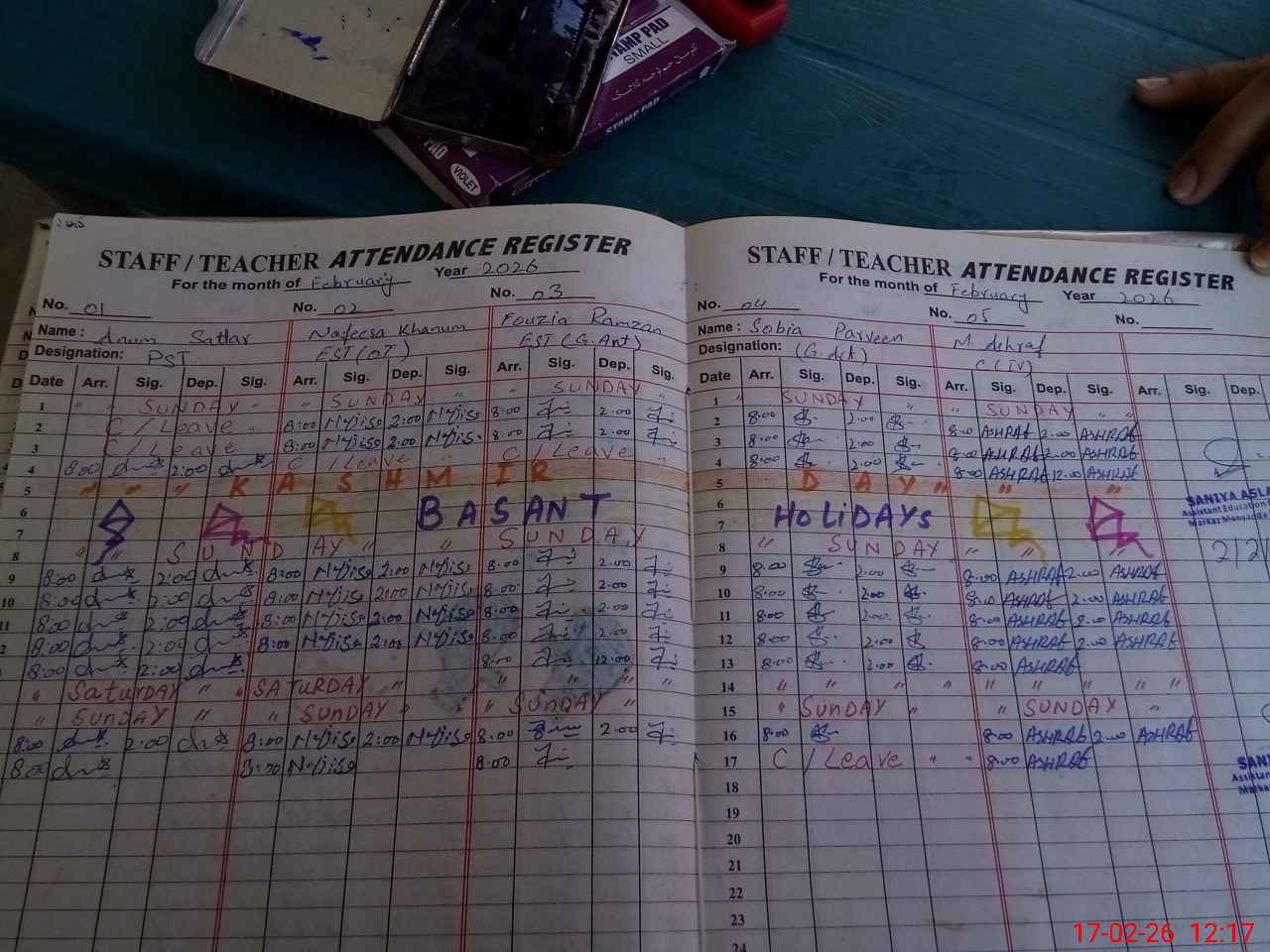 | CNIC | Full Name | Designation | R/C | Absence During Last Calender Month |