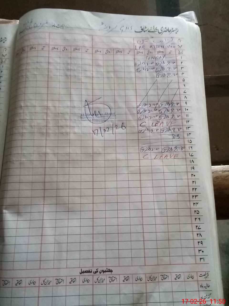 | CNIC | Full Name | Designation | R/C | Absence During Last Calender Month |