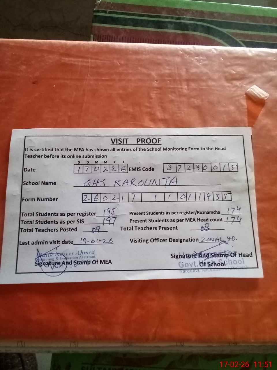 | Attendance Register | Head Teacher | MEA with School | Visit Proof |