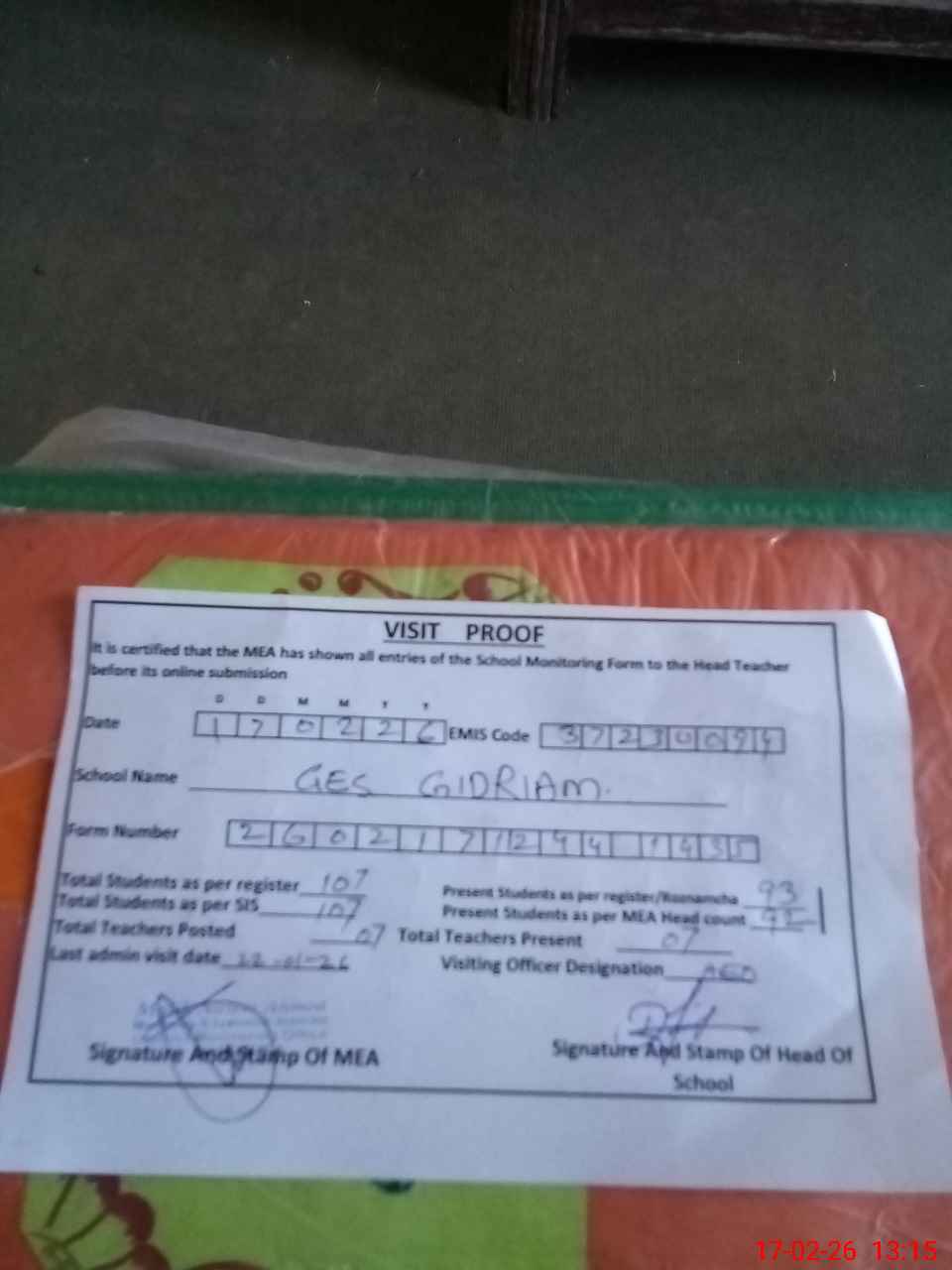| Attendance Register | Head Teacher | MEA with School | Visit Proof |