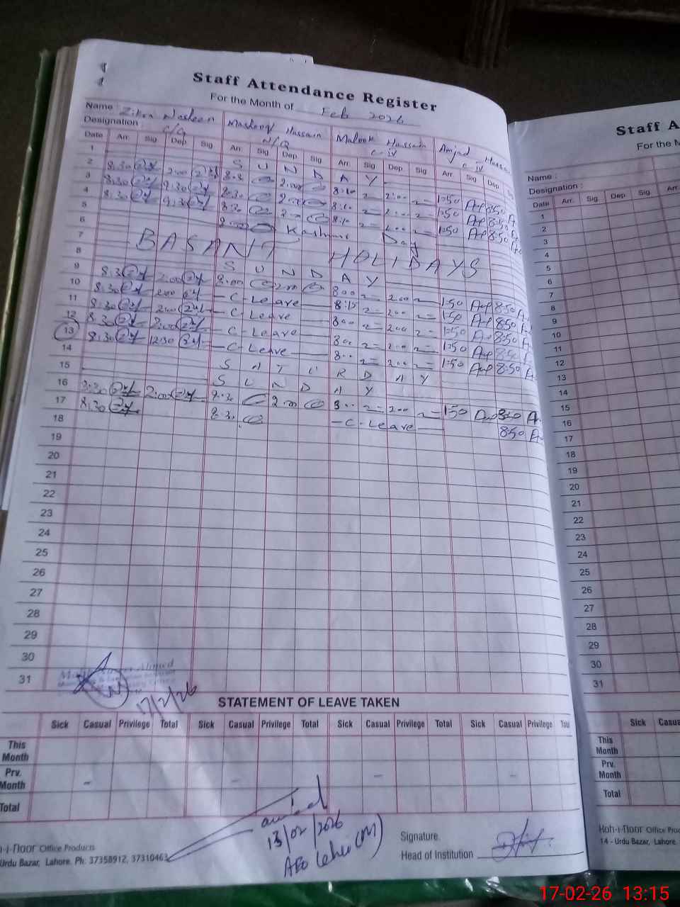 | CNIC | Full Name | Designation | R/C | Absence During Last Calender Month |