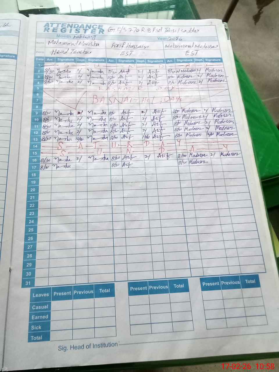 | CNIC | Full Name | Designation | R/C | Absence During Last Calender Month |