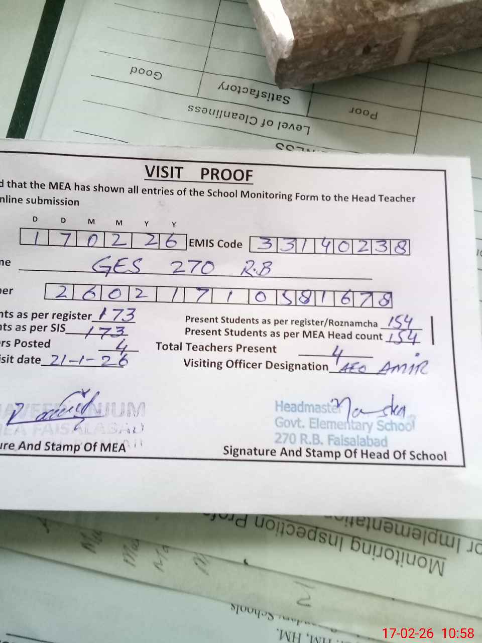 | Attendance Register | Head Teacher | MEA with School | Visit Proof |