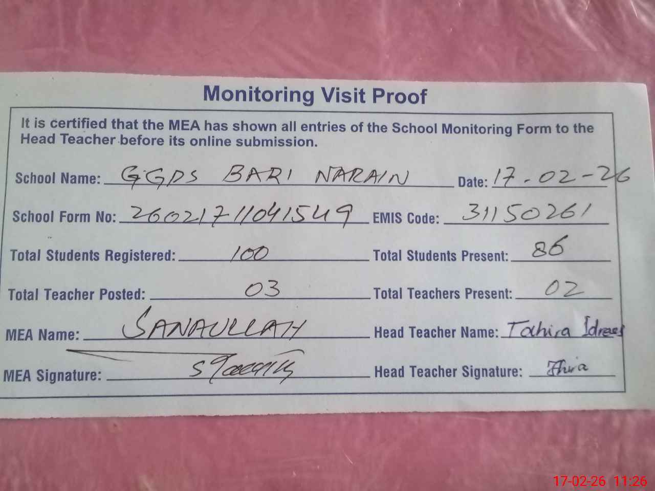 | Attendance Register | Head Teacher | MEA with School | Visit Proof |