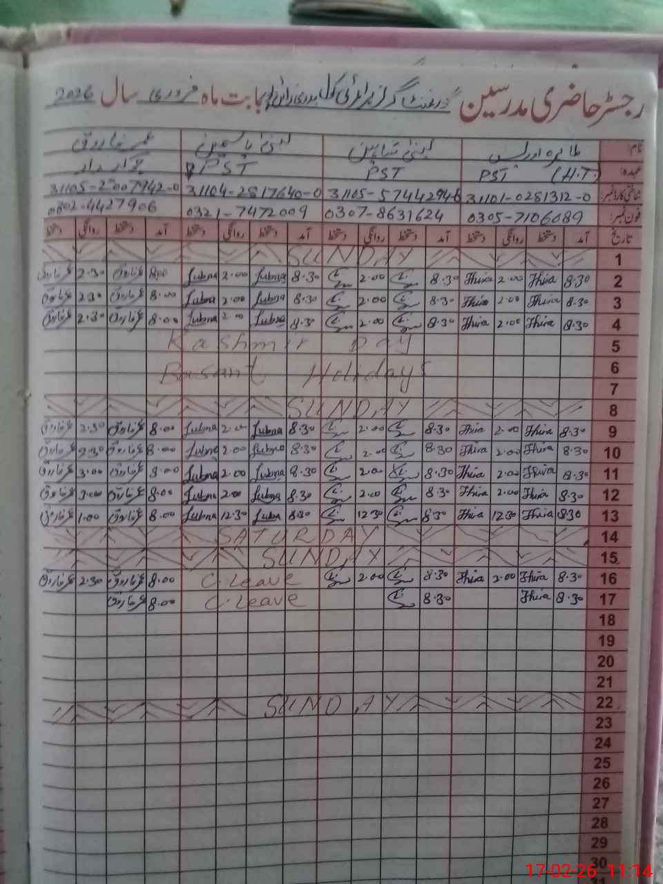 | CNIC | Full Name | Designation | R/C | Absence During Last Calender Month |