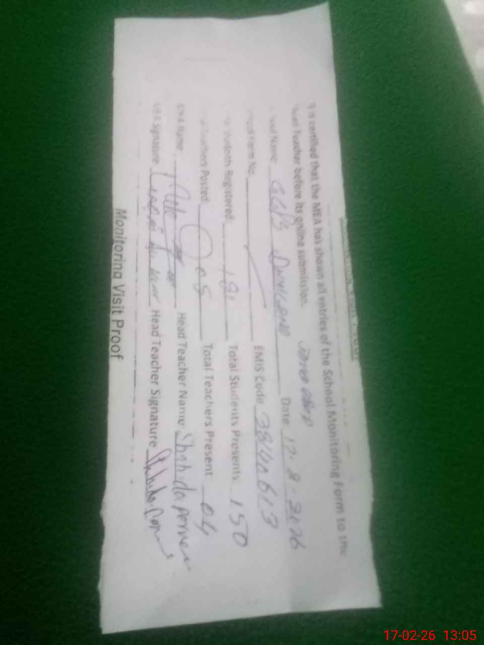| Attendance Register | Head Teacher | MEA with School | Visit Proof |