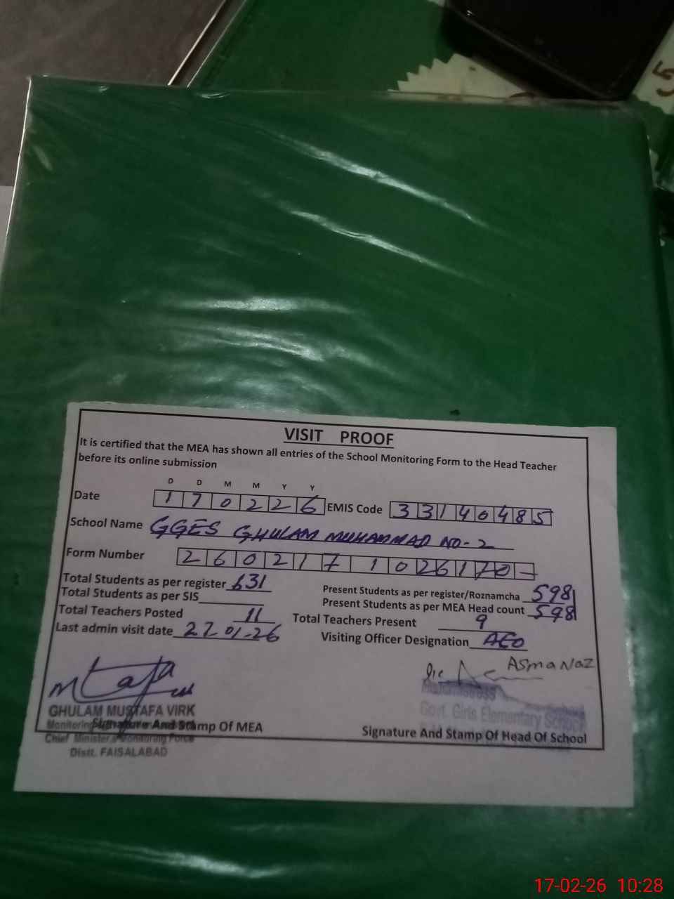 | Attendance Register | Head Teacher | MEA with School | Visit Proof |