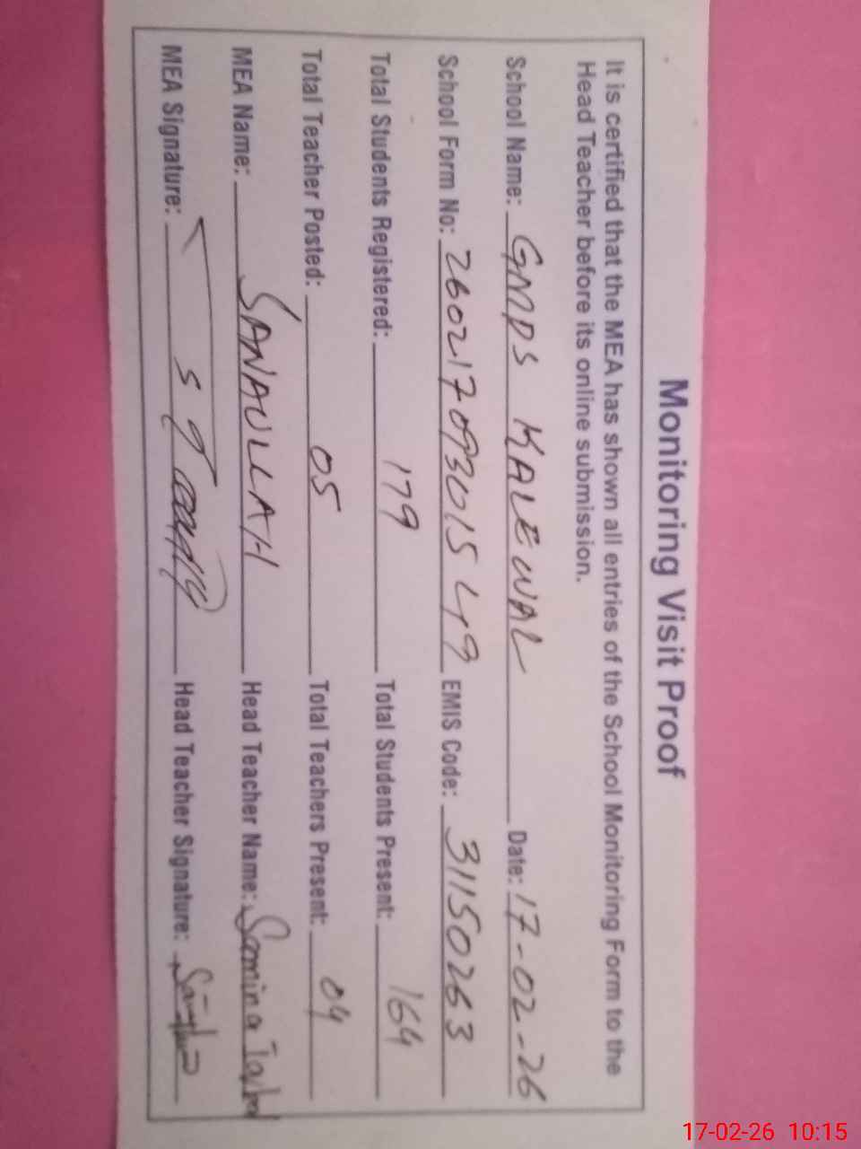 | EMIS Code: 31150263 | Name of School: GMPS KALE WAL | |||