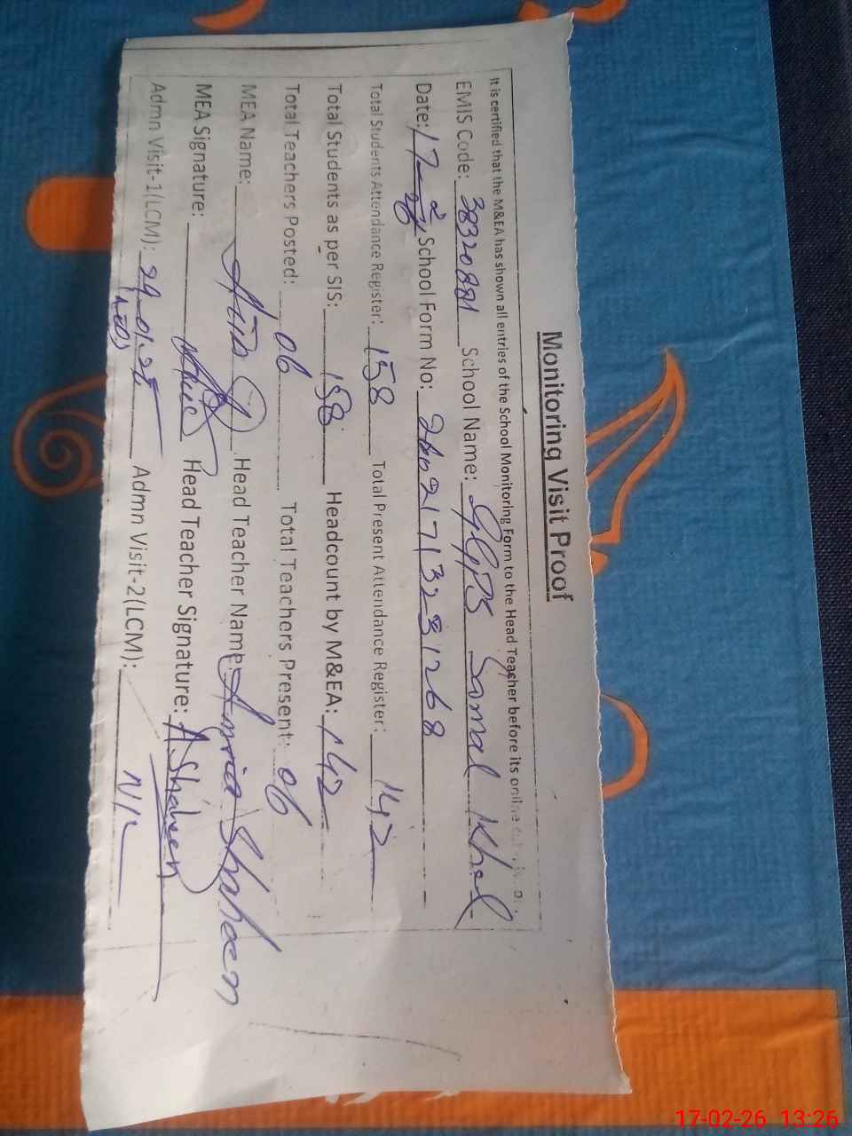 | Attendance Register | Head Teacher | MEA with School | Visit Proof |