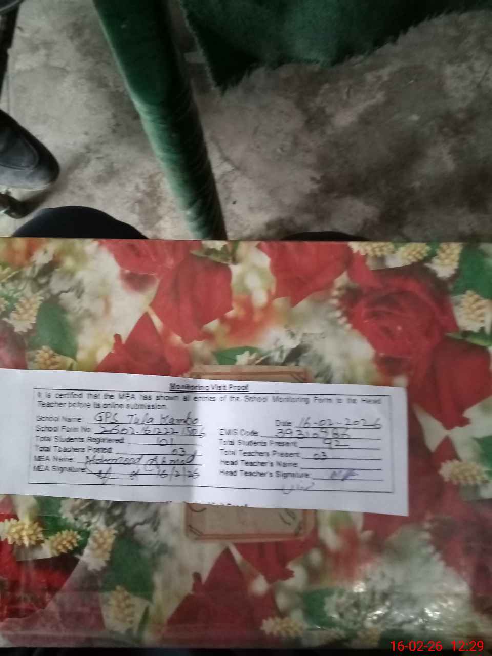 | Attendance Register | Head Teacher | MEA with School | Visit Proof |