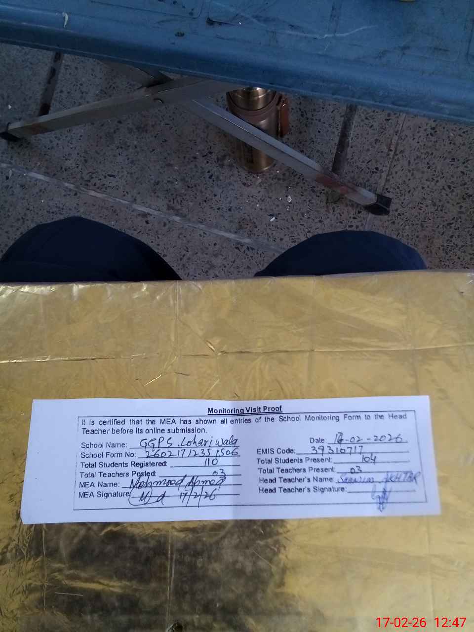 | Attendance Register | Head Teacher | MEA with School | Visit Proof |