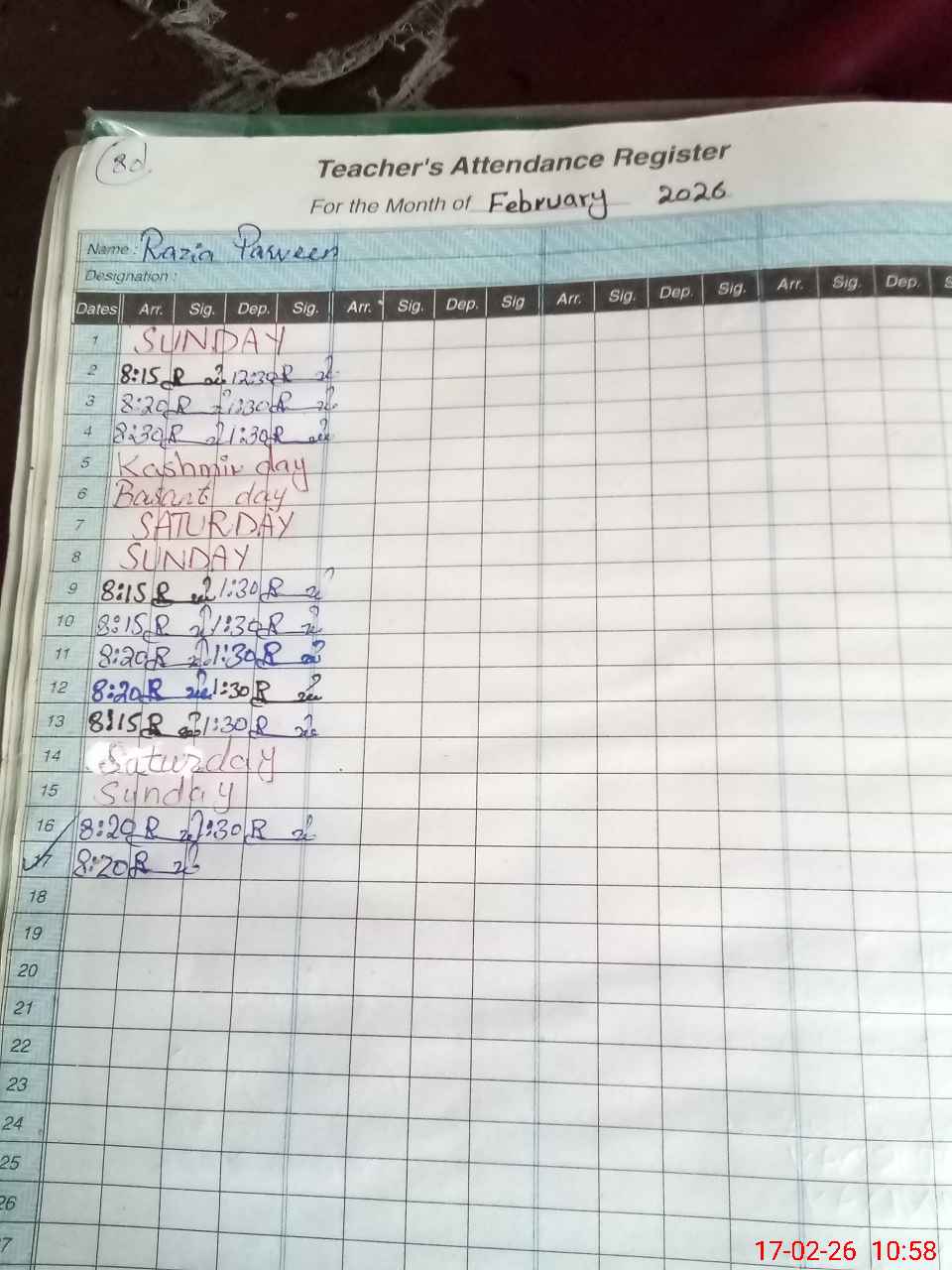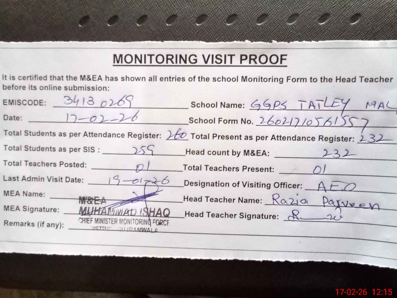 | Remarks (Use Separate Page if Required): SCHOOL RUNNING AS AFTERNOON VERIFIED 12 FROM 12 STUDENTS OF CLASS 06 No Admin VISIT After 19 JANUARY 2026 Electricity waring not safe Need more energy sawer in class rooms water moter is out of order | |||||