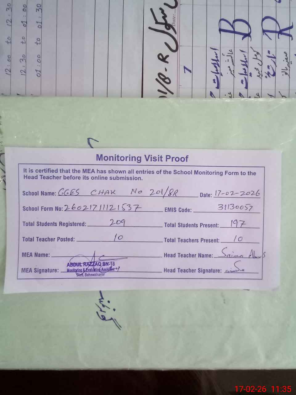| EMIS Code: 31130057 | Name of School: GGES CHAK NO. 201/8-R P/O KHICHI WALA | |||