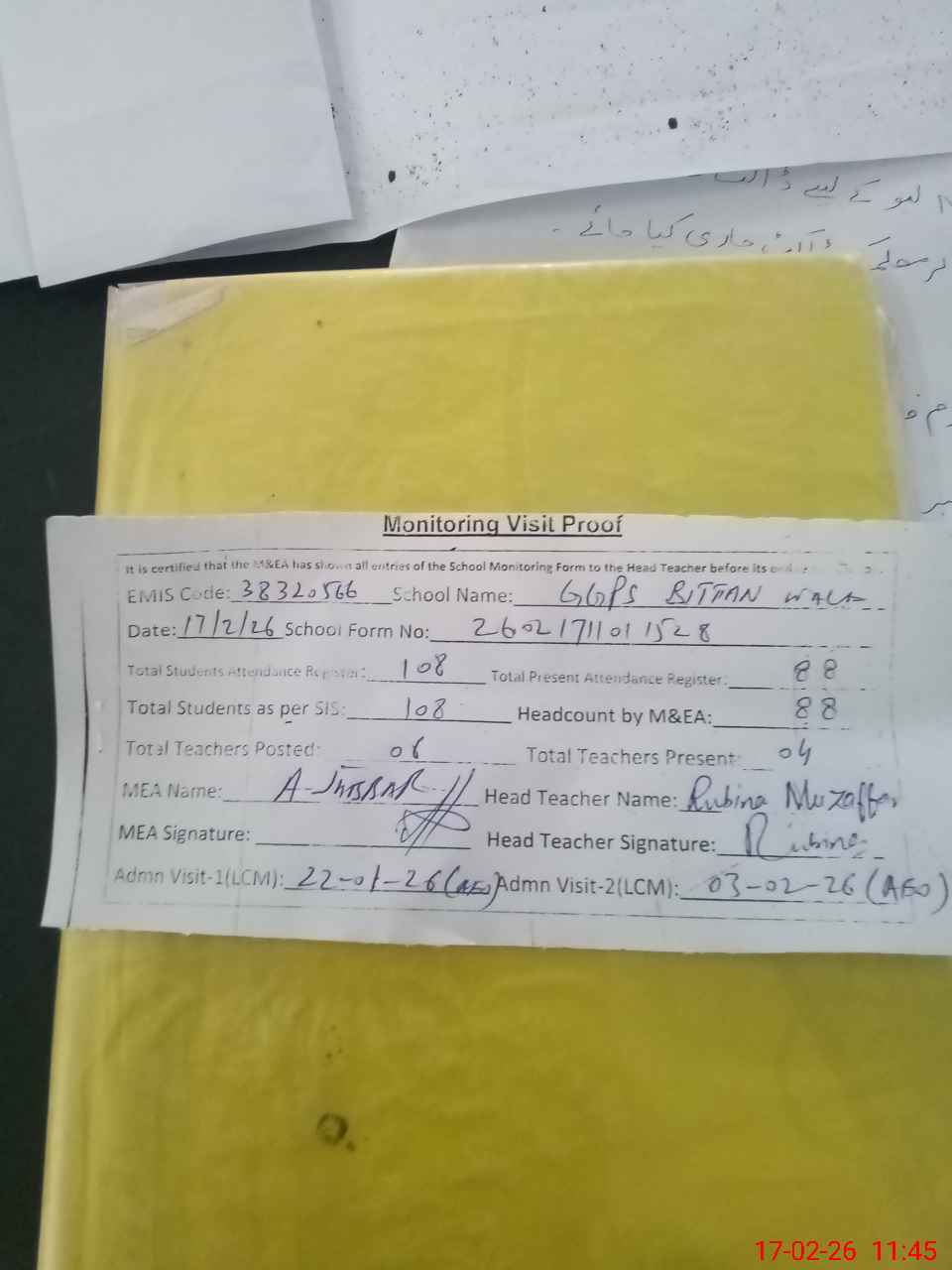 | Attendance Register | Head Teacher | MEA with School | Visit Proof |