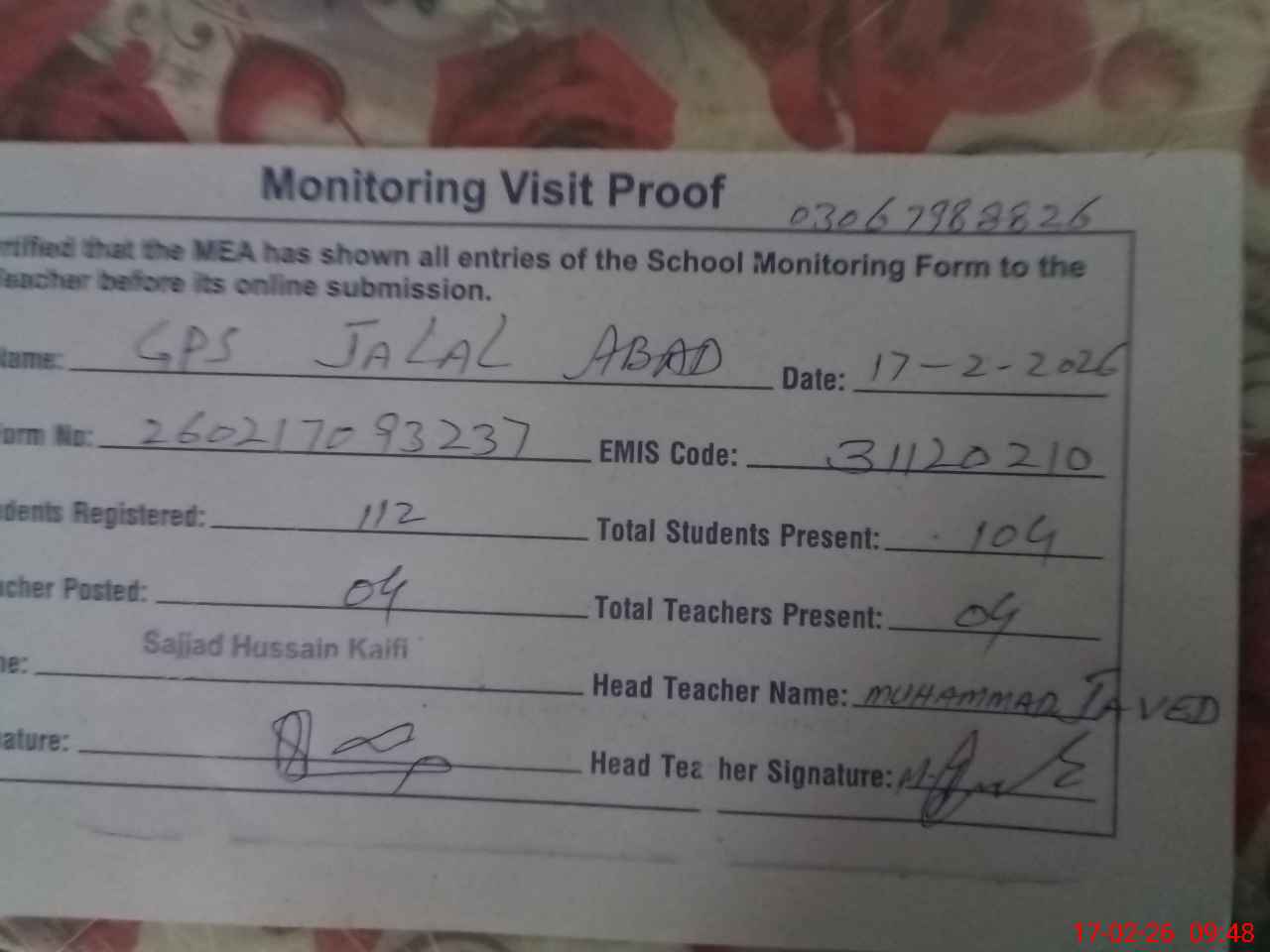 | EMIS Code: 31120210 | Name of School: GPS JALLAL ABAD | |||