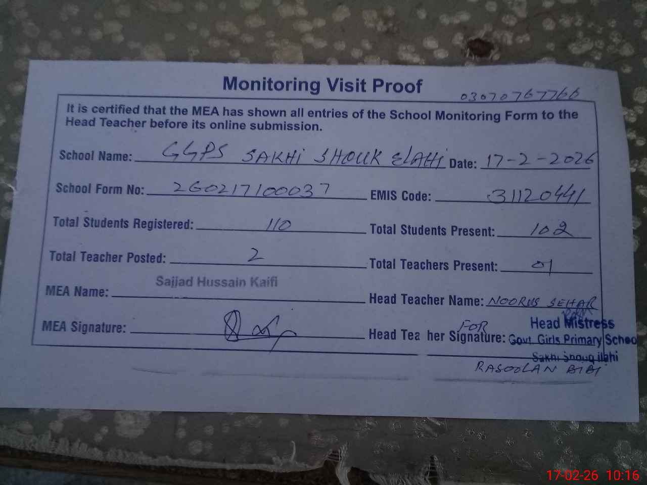 | Attendance Register | Head Teacher | MEA with School | Visit Proof |