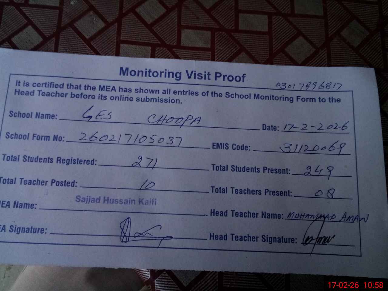 | Attendance Register | Head Teacher | MEA with School | Visit Proof |