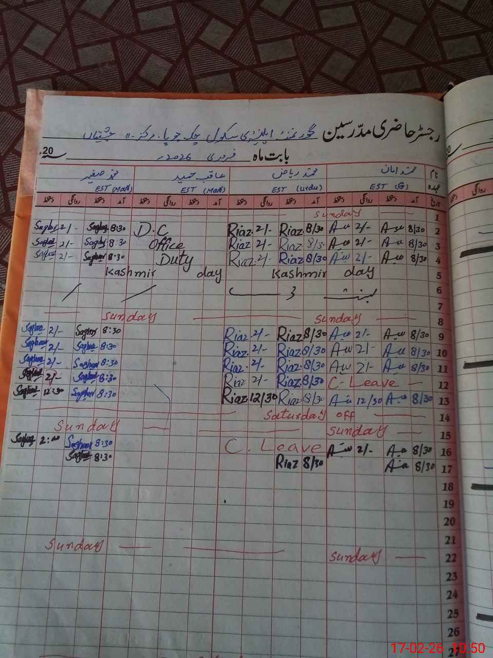 | CNIC | Full Name | Designation | R/C | Absence During Last Calender Month |