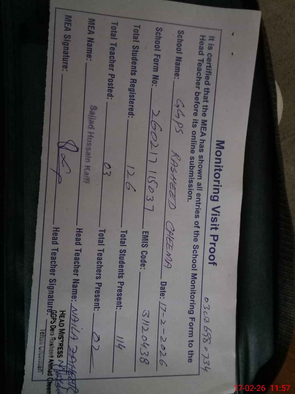 | Attendance Register | Head Teacher | MEA with School | Visit Proof |